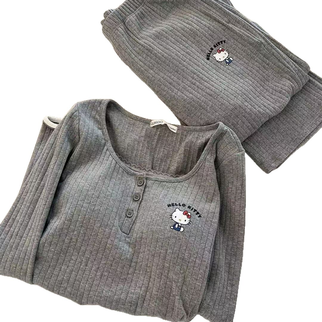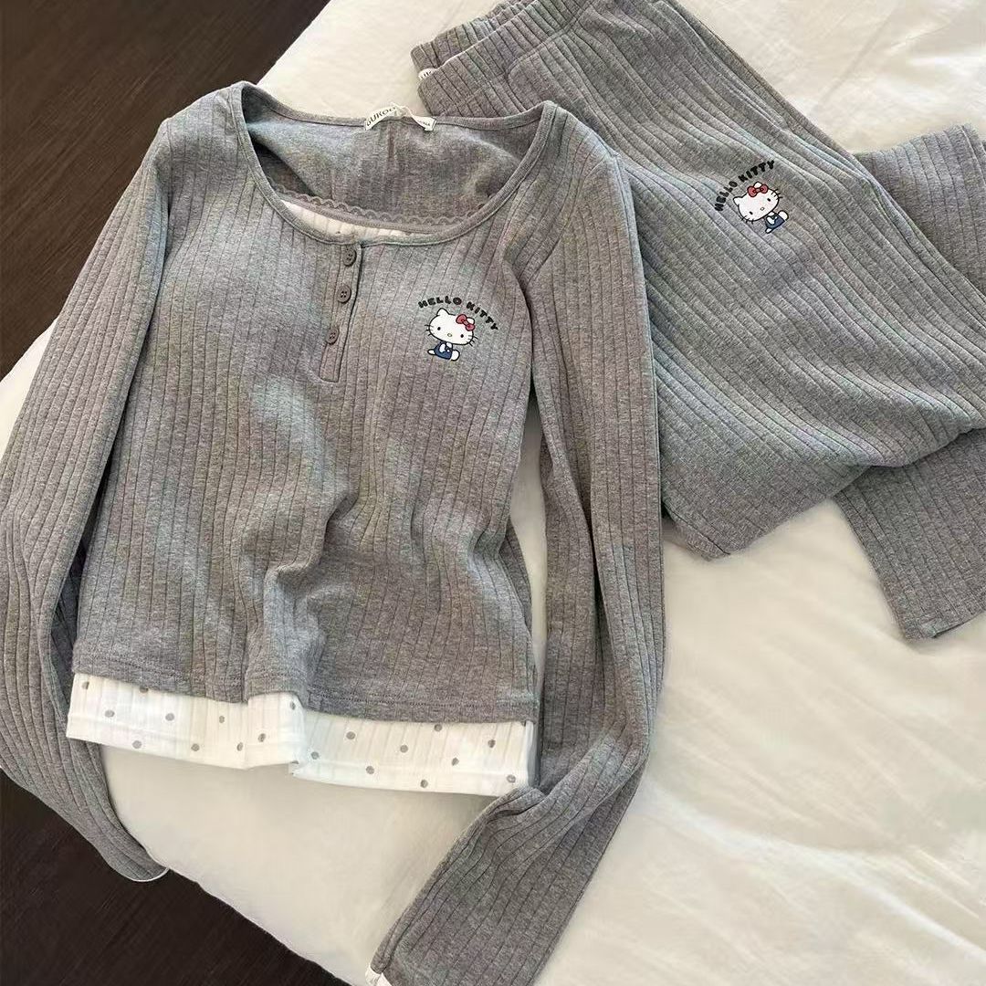 韩版KT猫撞色假两件睡衣女带胸垫坑条长袖春秋季可外穿家居服套装