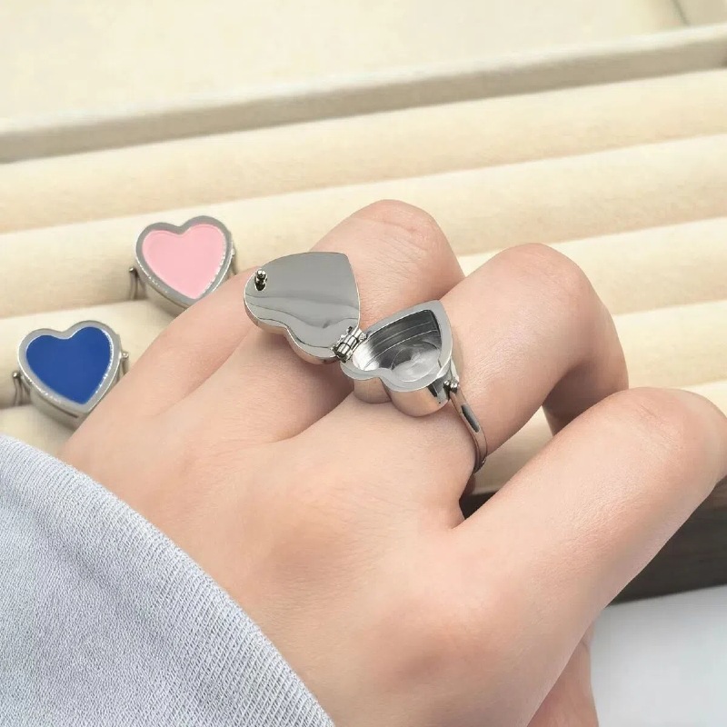 跨境小众设计多功能心形不锈钢戒指可打开收纳中性风香薰急救药丸