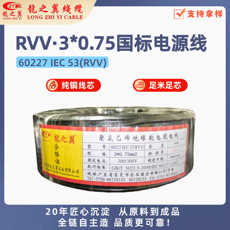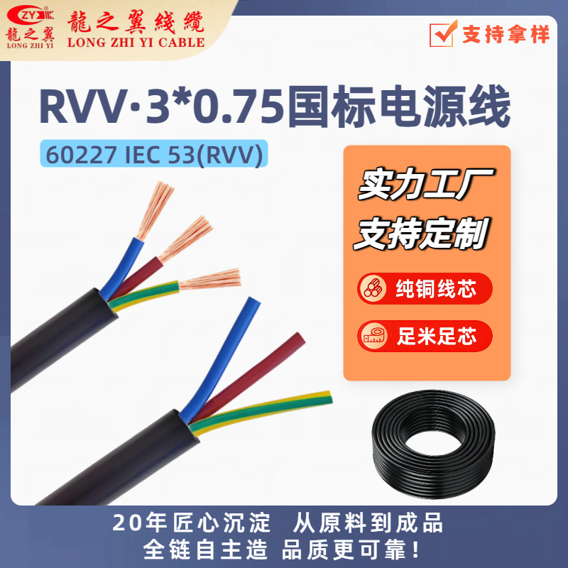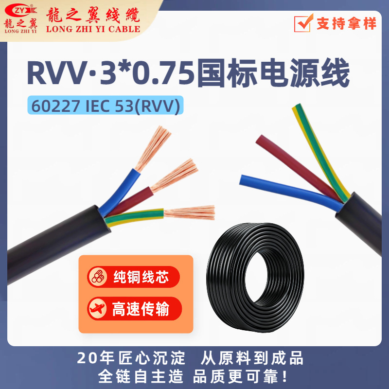龙之翼 RVV3*0.75平方国标电源线3芯护套线无氧铜家电插头连接线