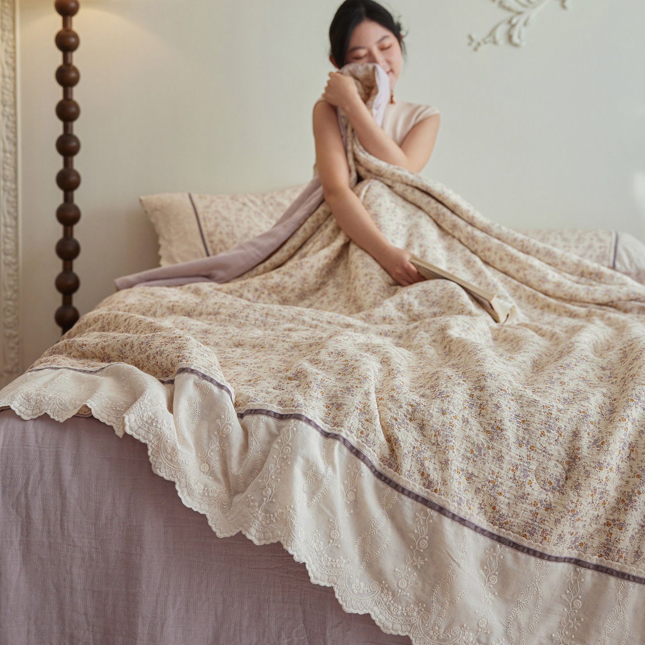 A类双层纱夏凉被透气四件套蕾丝花边薄被子可机洗夏季空调被柔软