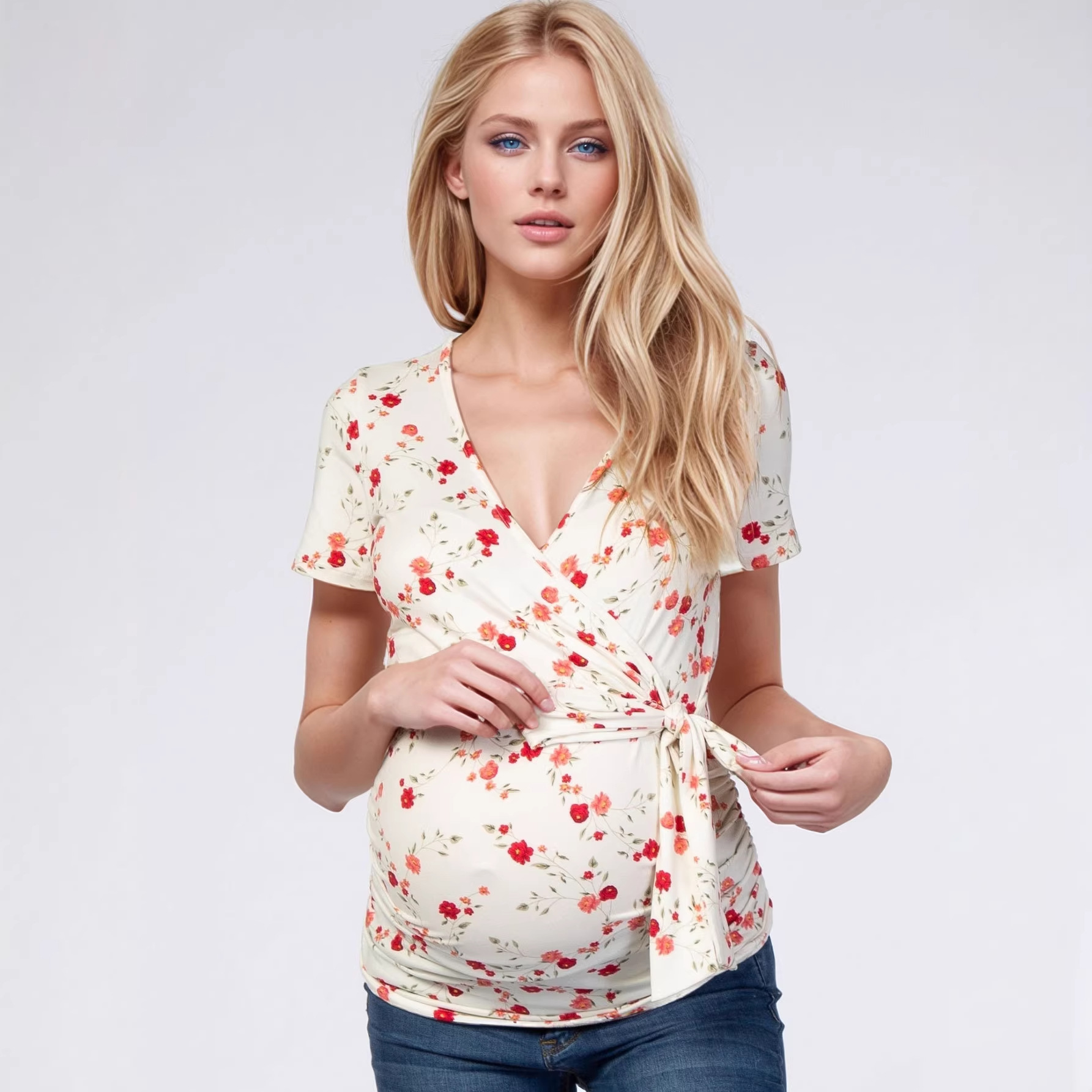 2026跨境新款女士V领短袖收腰系带孕妇T恤休闲穿搭女士孕期服饰