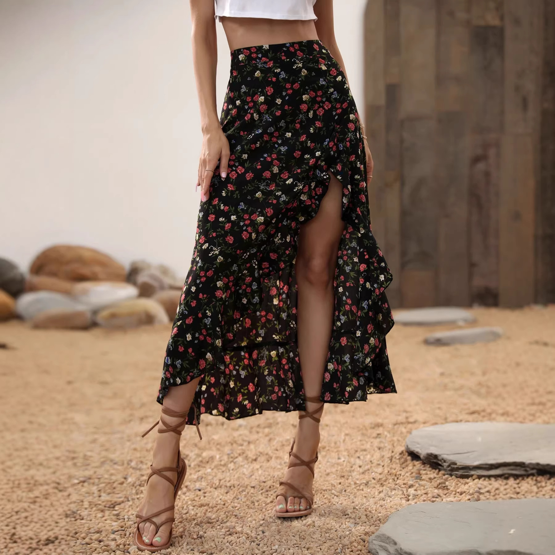 高腰荷叶边不规则碎花雪纺半身裙旅游沙滩防晒一片式系带鱼尾长裙