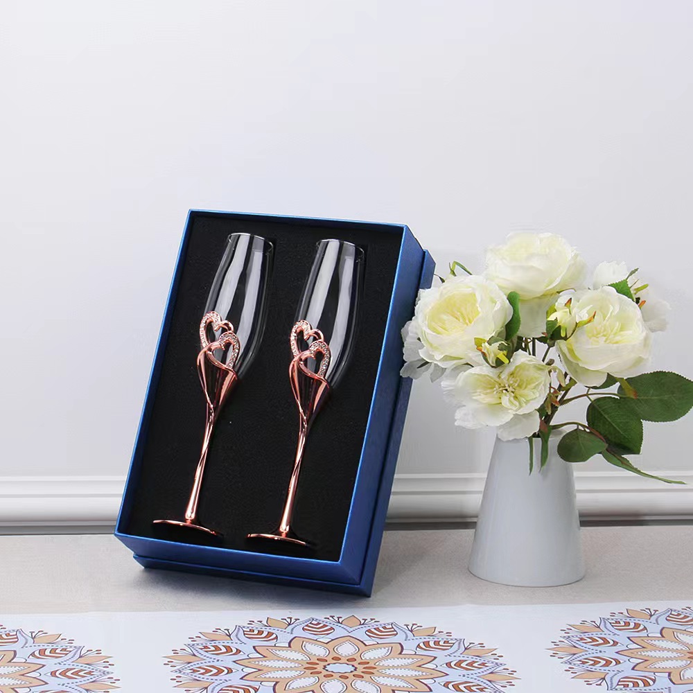 婚庆爱心香槟杯不锈钢底座带水晶钻石透明高脚杯玫瑰金红酒杯批发