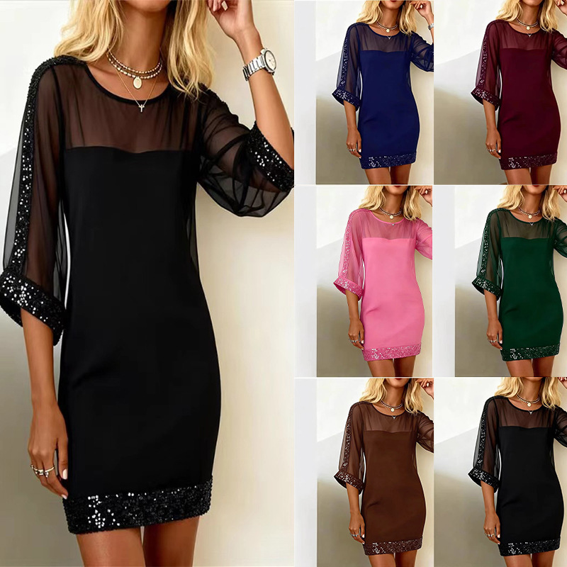 2025亚马逊跨境新款春夏时尚拼接网纱亮片圆领性感女装修身连衣裙