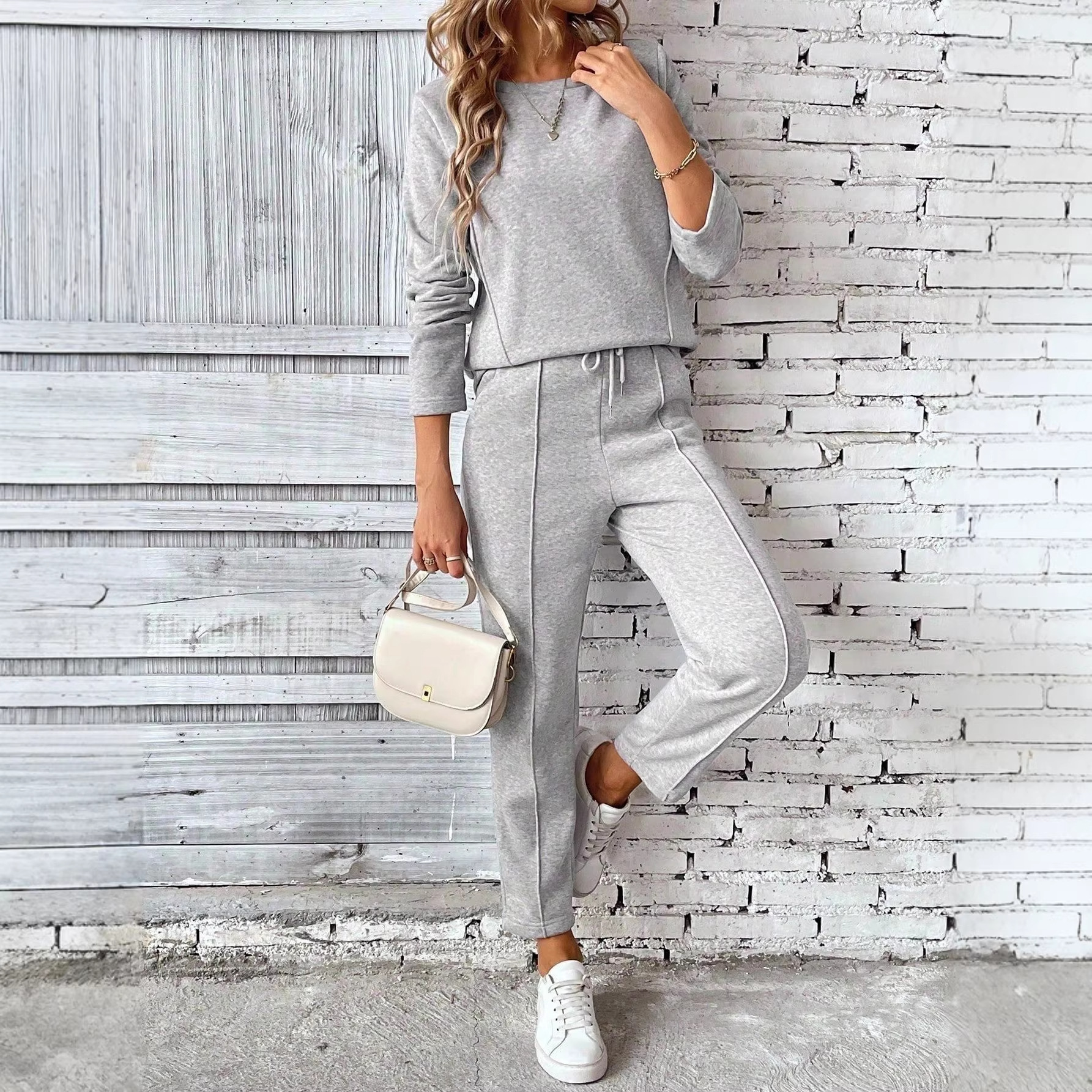 矮款小个子跨境女装欧美圆领卫衣料长袖抽绳长裤套装女休闲通勤