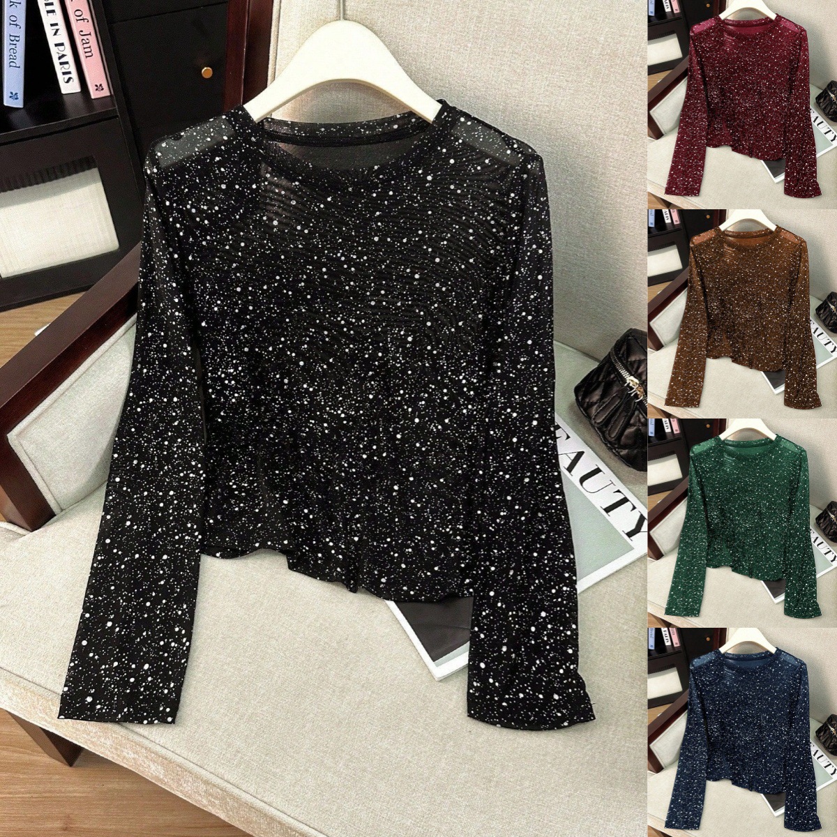 现货标码欧美时尚辣妹亮片透视长袖T恤上衣女打底衫跨境专供