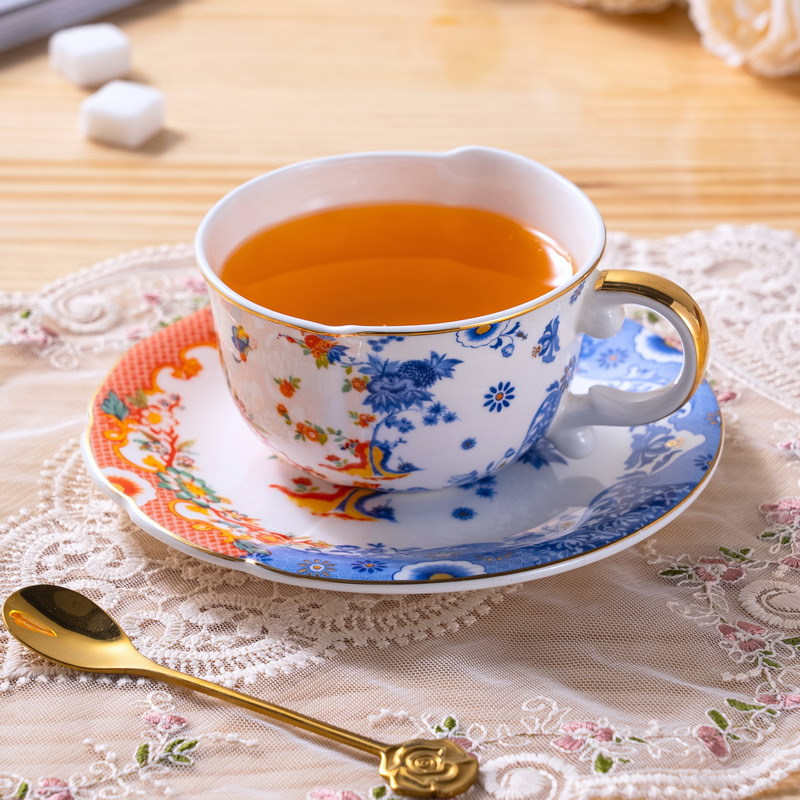 高骨瓷新中式描金把不规则咖啡杯碟莲纹青花古典风格陶瓷杯骨瓷杯