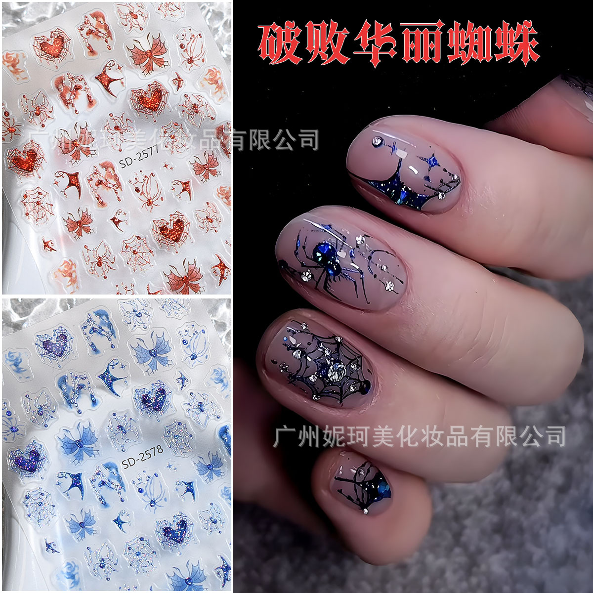 暗黑系蜘蛛美甲贴纸新款流光蛛丝红色蝴蝶爱心蜘蛛网指甲背SD2577