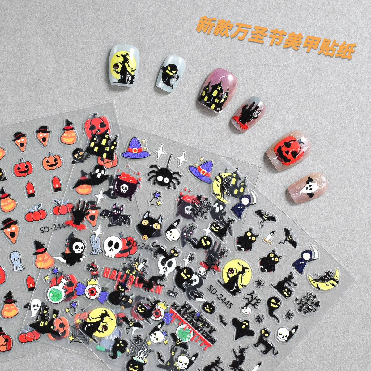 新款卡通美甲贴纸万圣节蜘蛛立体小幽灵南瓜蜘蛛网背胶装饰指甲贴