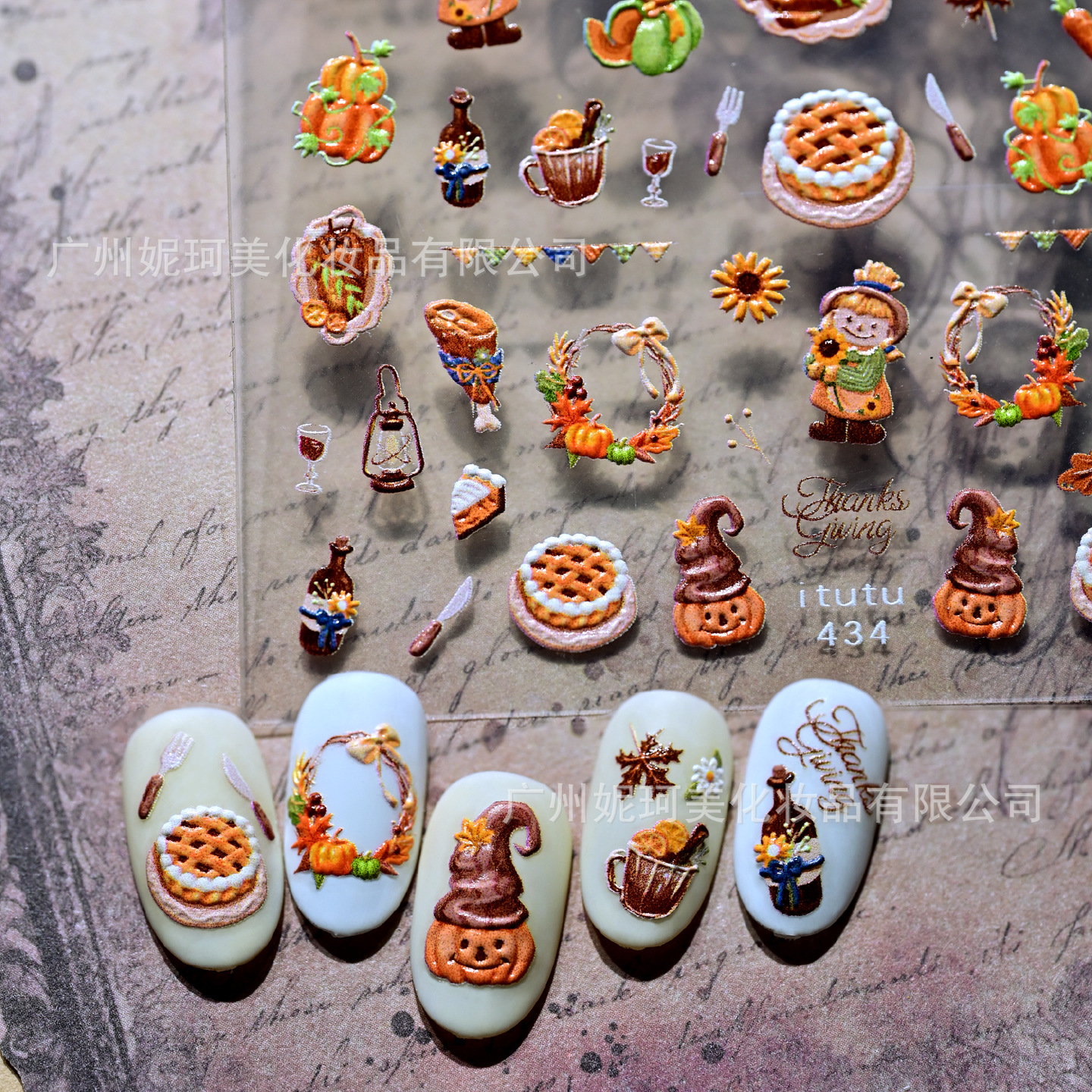 秋日松鼠松果浮雕立体美甲贴纸秋日丰收南瓜枫叶向日葵花朵美甲贴