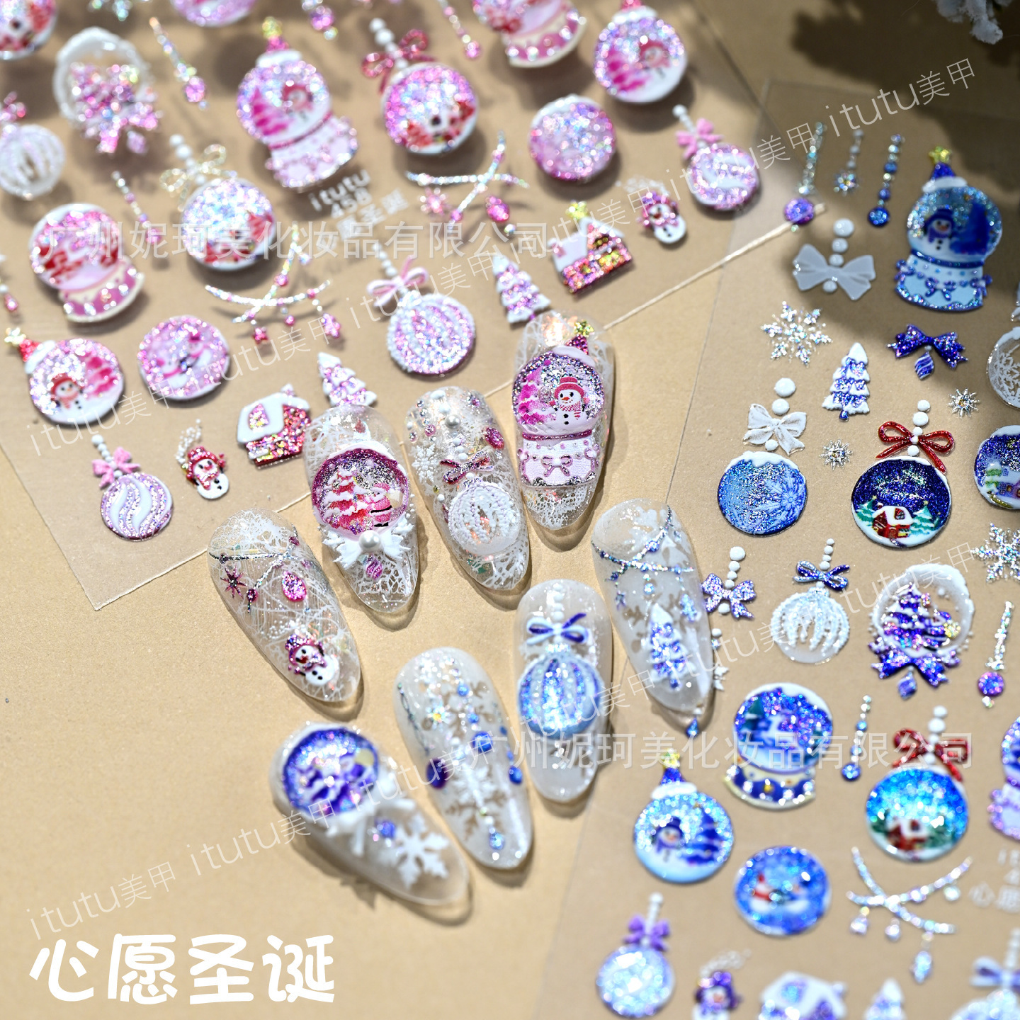 新款心愿圣诞浮雕炫彩美甲贴纸水晶球圣诞树雪花指尖图案itutu458