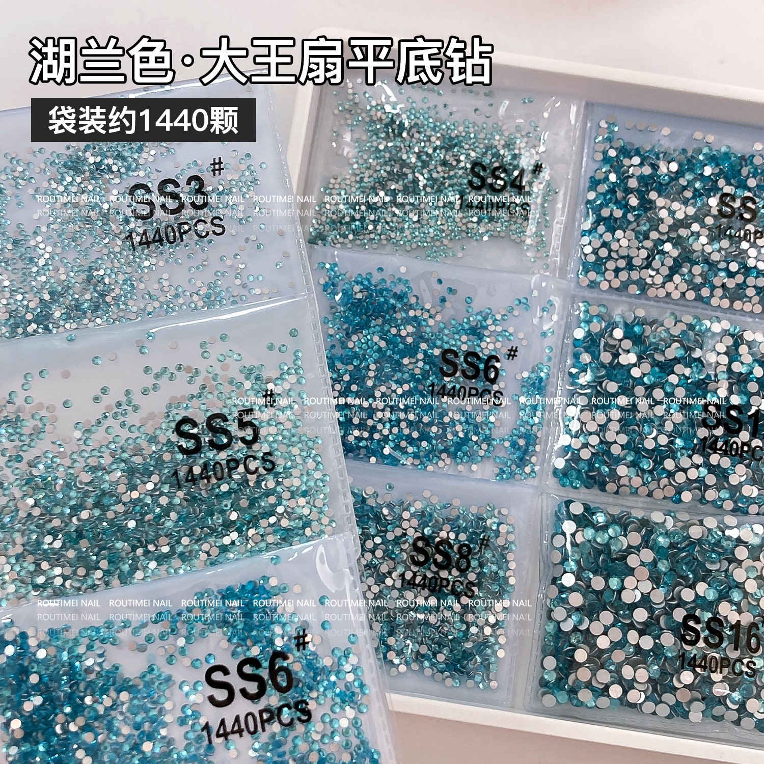 湖蓝色多尺寸大王扇平底钻指甲钻饰袋装1440颗爆闪百搭小红书爆款