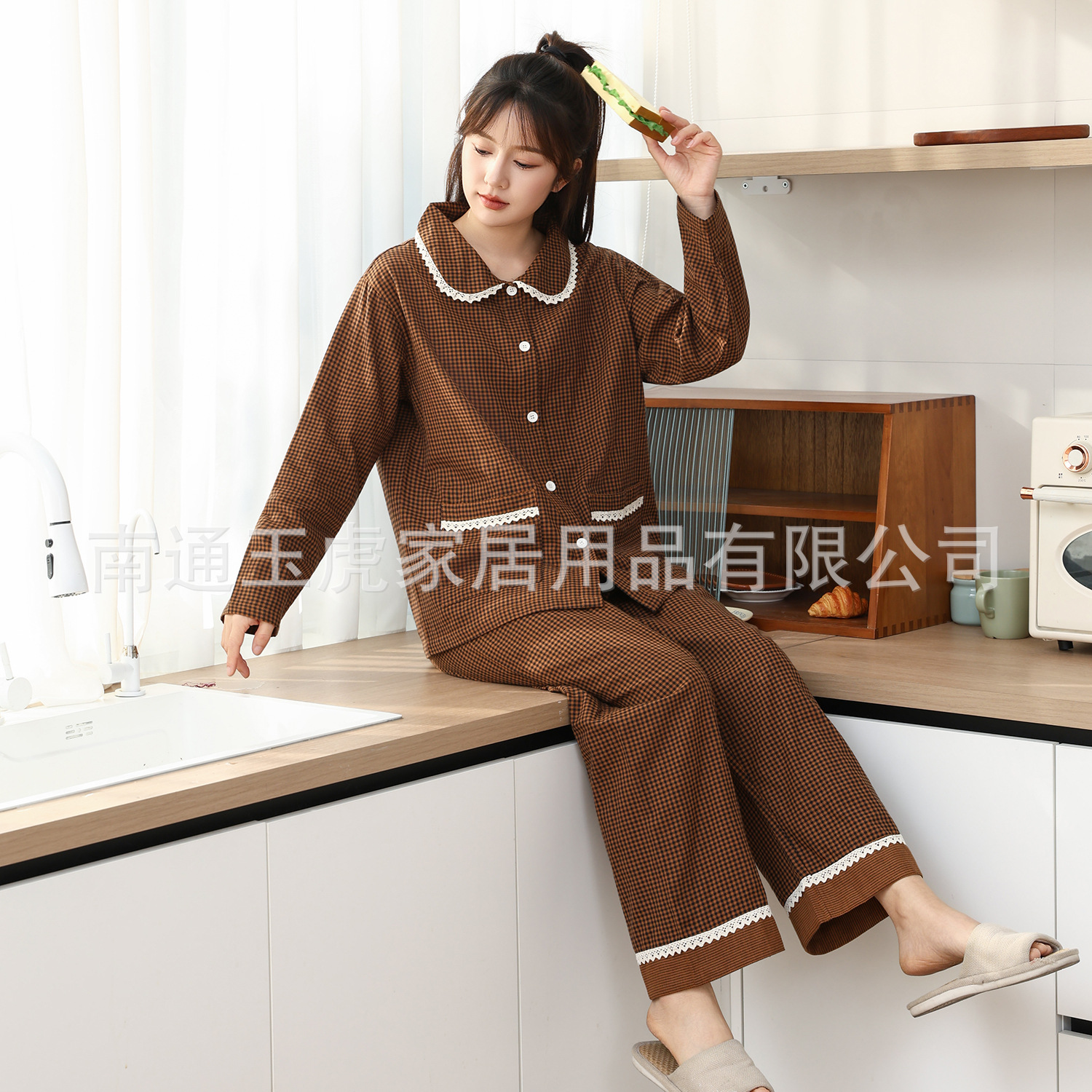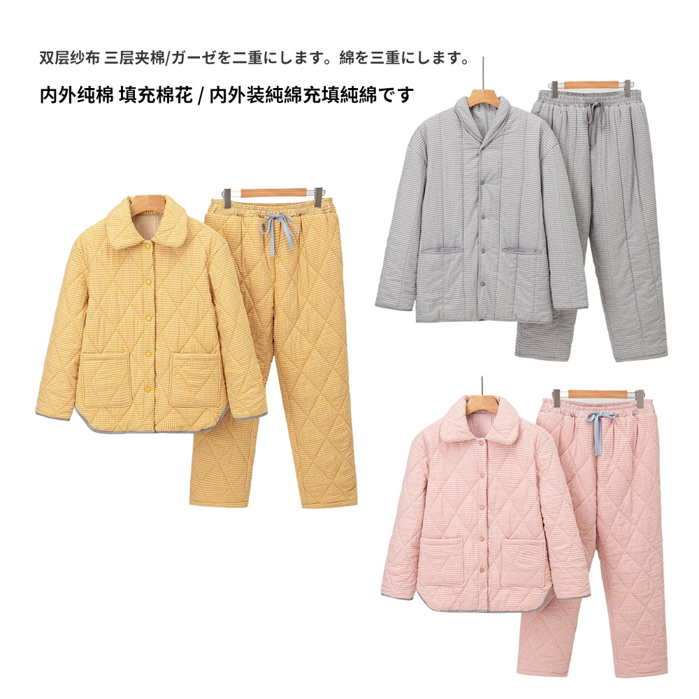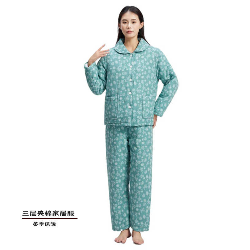 冬季保暖纯棉双层纱夹棉袄睡衣加厚女士提花加厚棉服家居服套装