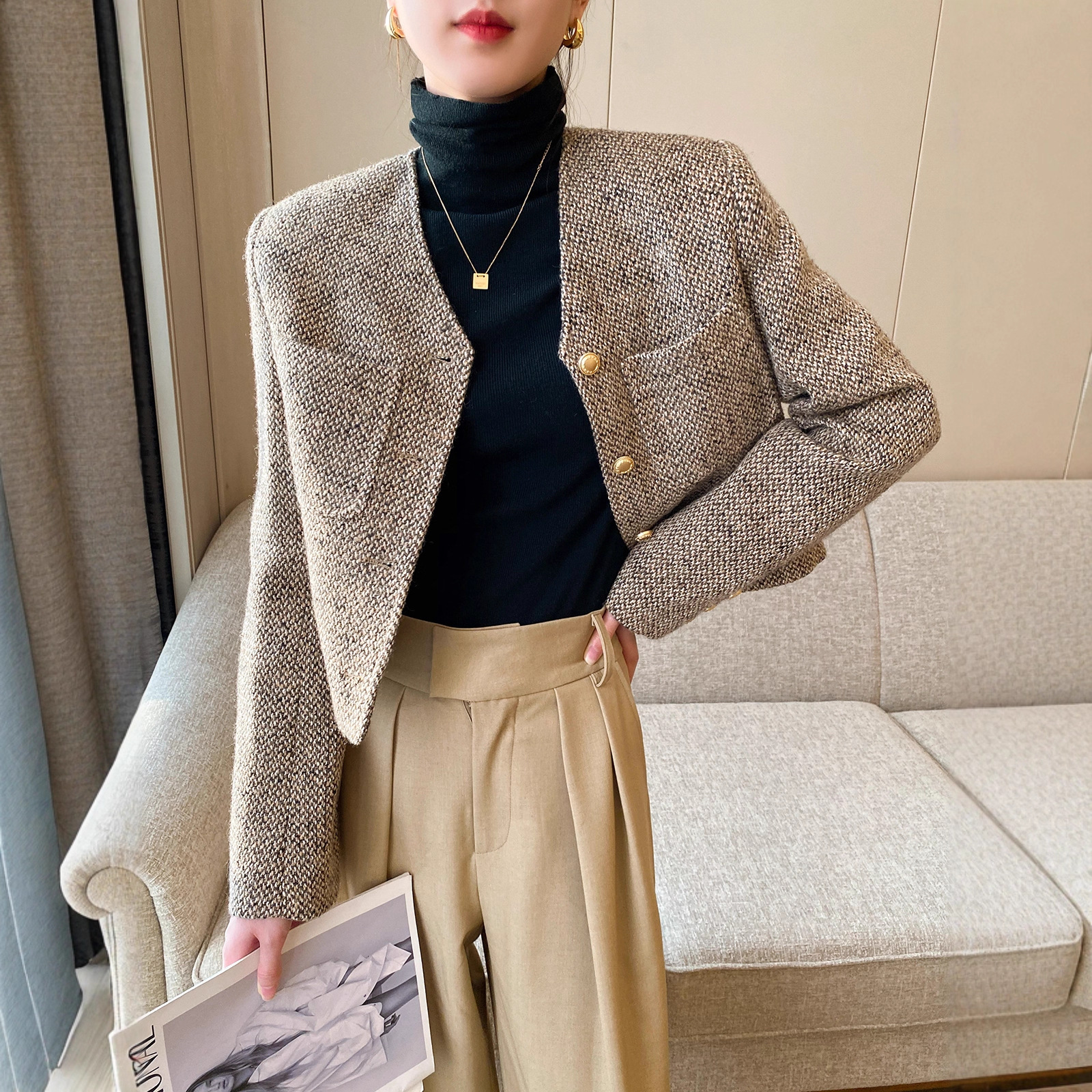 2025简约咖色小香风粗花呢法式短款上衣女春季新款洋气高级感外套