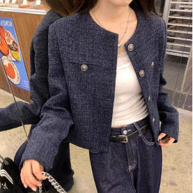 藏蓝色法式长袖松弛小香风外套2025秋季设计单排扣气质短款上衣