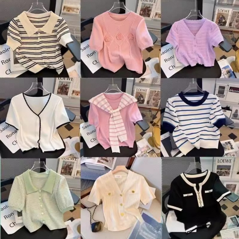 夏季冰丝针织衫短袖设计感小众短款t恤女装学生高腰上衣潮