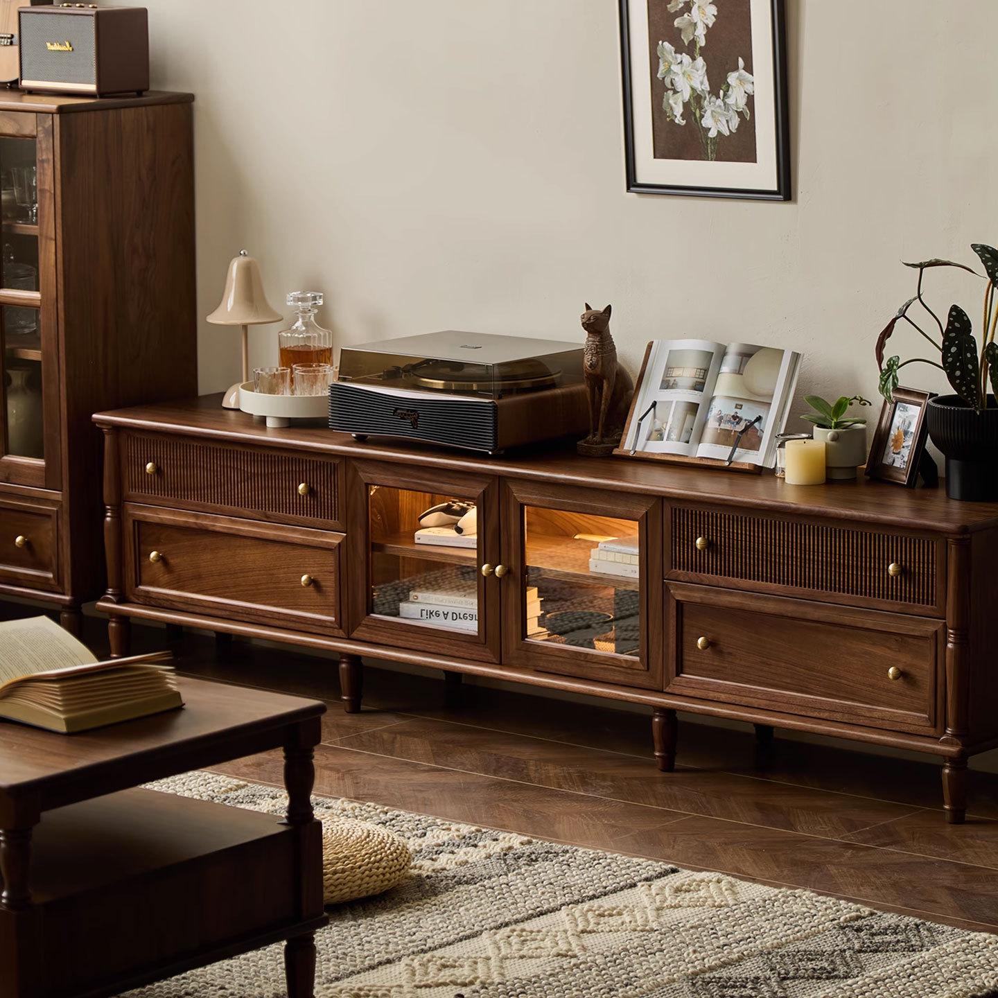 北美黑胡桃木复古电视柜边柜组合北欧实木樱桃木小户型中古储物柜