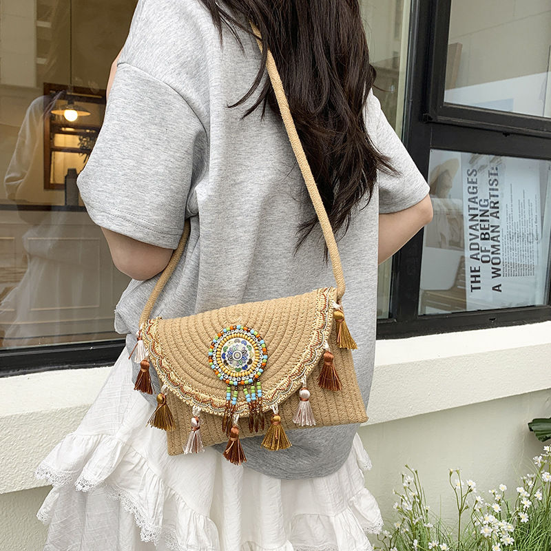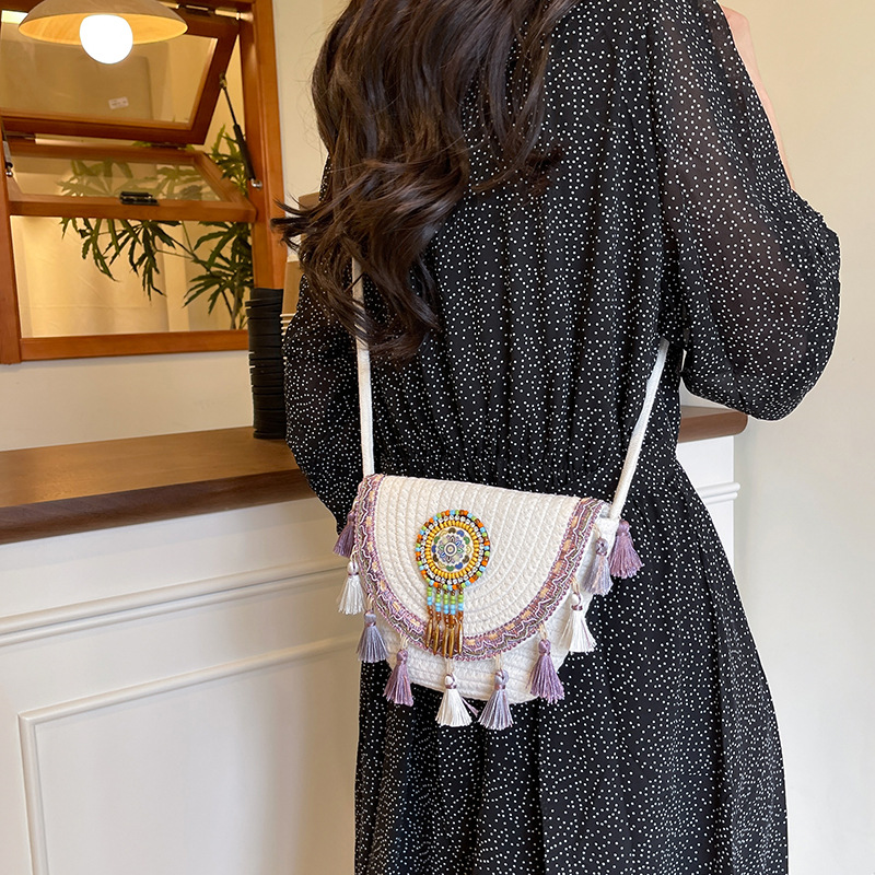 2025潮流民族沙滩流苏包女式夏季草编撞色休闲手工单肩斜挎包