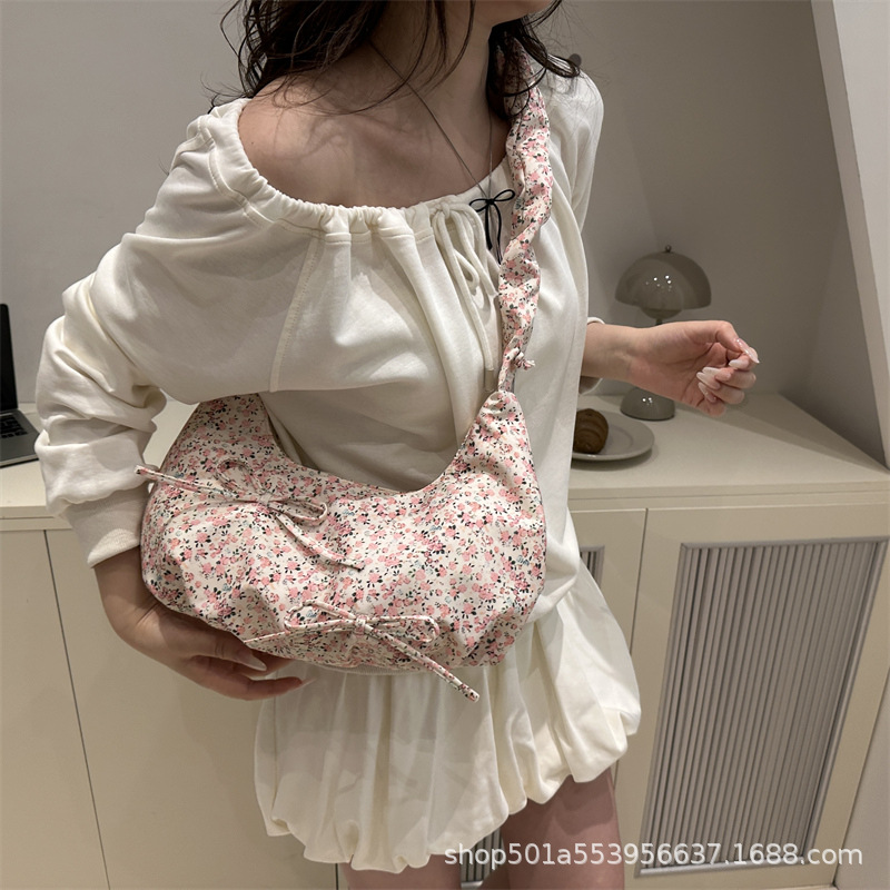 小清新高颜值蝴蝶结碎花斜挎包褶皱云朵单肩腋下包休闲斜挎帆布包
