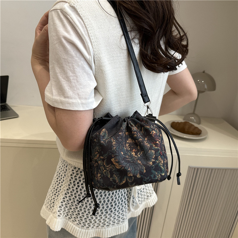 时尚简约防香云纱抽绳零钱包新中式国风印花便携束口斜挎水桶包包