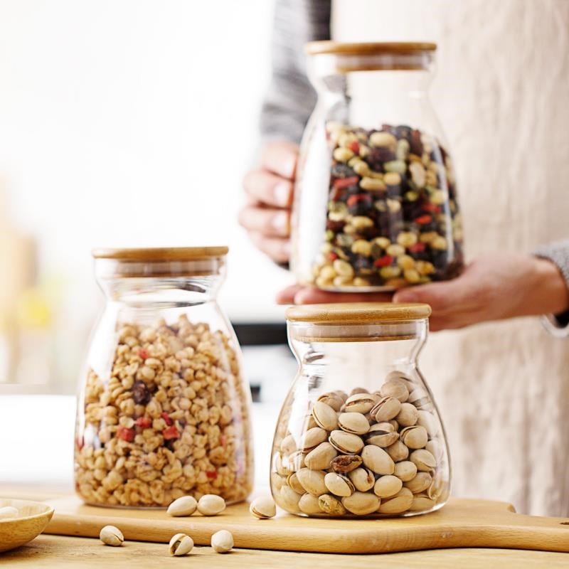 批发带盖玻璃密封瓶罐茶叶罐杂粮收纳罐竹盖干果罐竹盖玻璃调料罐