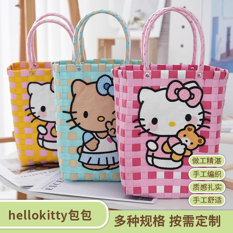 KT猫编织包少女辣妹凯蒂猫菜篮子长肩带挎包化妆品洗漱收纳包