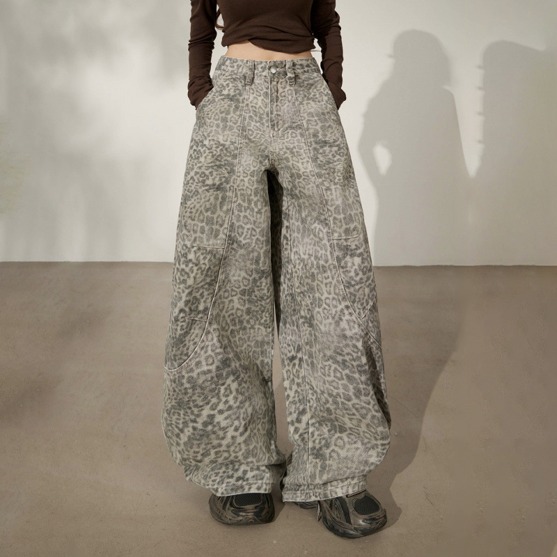 美式复古高腰宽松阔腿裤豹纹弯刀裤百搭2025秋冬垂感镰刀牛仔裤女