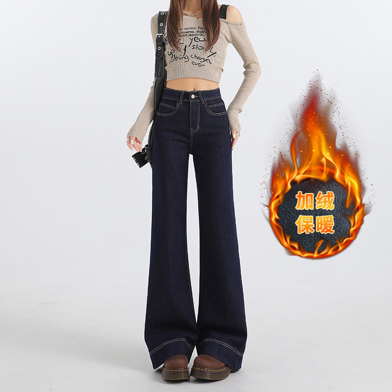 2025年冬季加绒加厚牛仔长裤女美式高腰丹宁蓝宽松百搭阔腿喇叭裤