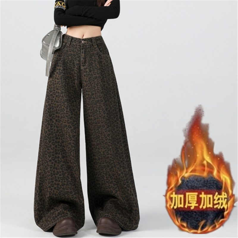 2025冬季新款加绒加厚牛仔长裤女美式高腰豹纹保暖宽松阔腿休闲裤