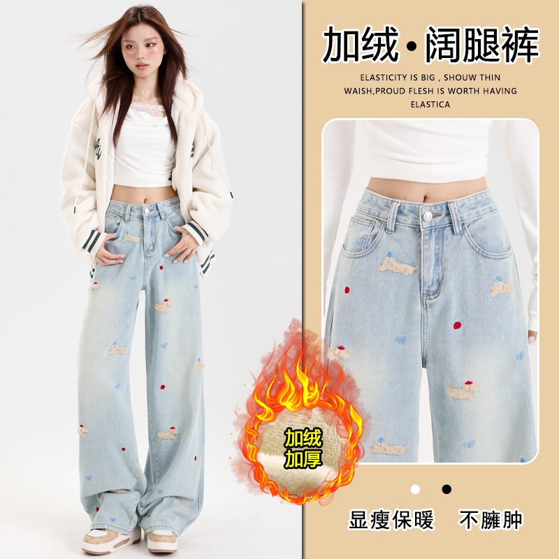 2025冬季新款加绒加厚牛仔长裤女腊肠小狗刺绣宽松保暖阔腿拖地裤