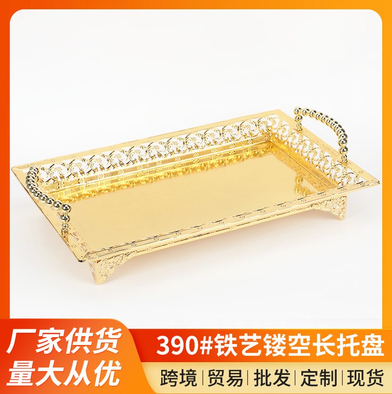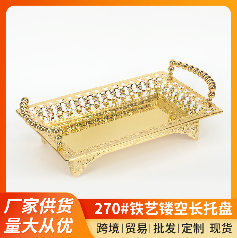 跨境北欧铁艺长托盘 金色银色镂空水果零食收纳盘酒店KTV小吃果盘