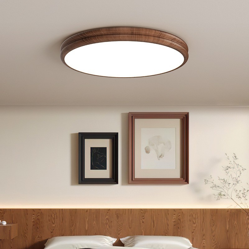 新款超薄简约木纹吸顶灯胡桃木圆形房间灯卧室过道灯源头中山工厂