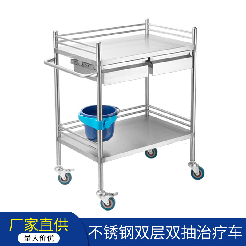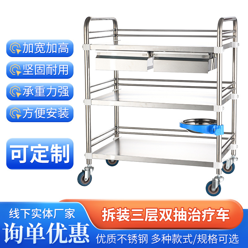 不锈钢推车三层双抽治疗车美容推车实验室器械工具车医院小手推车