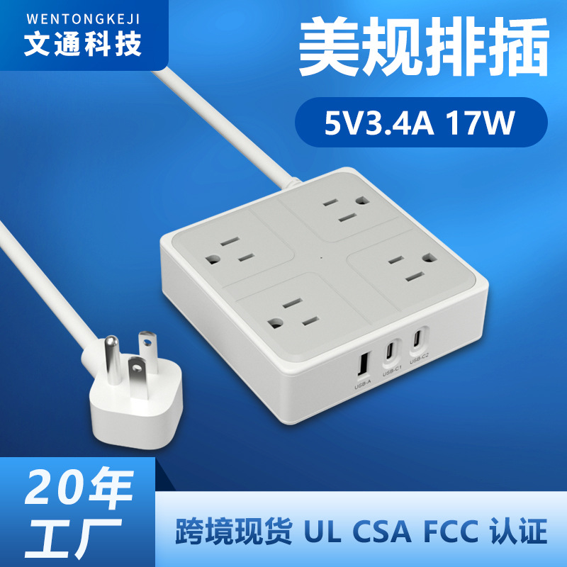 美规排插工厂家用防浪涌USB-C快充接线板大功率智能插排拖线板