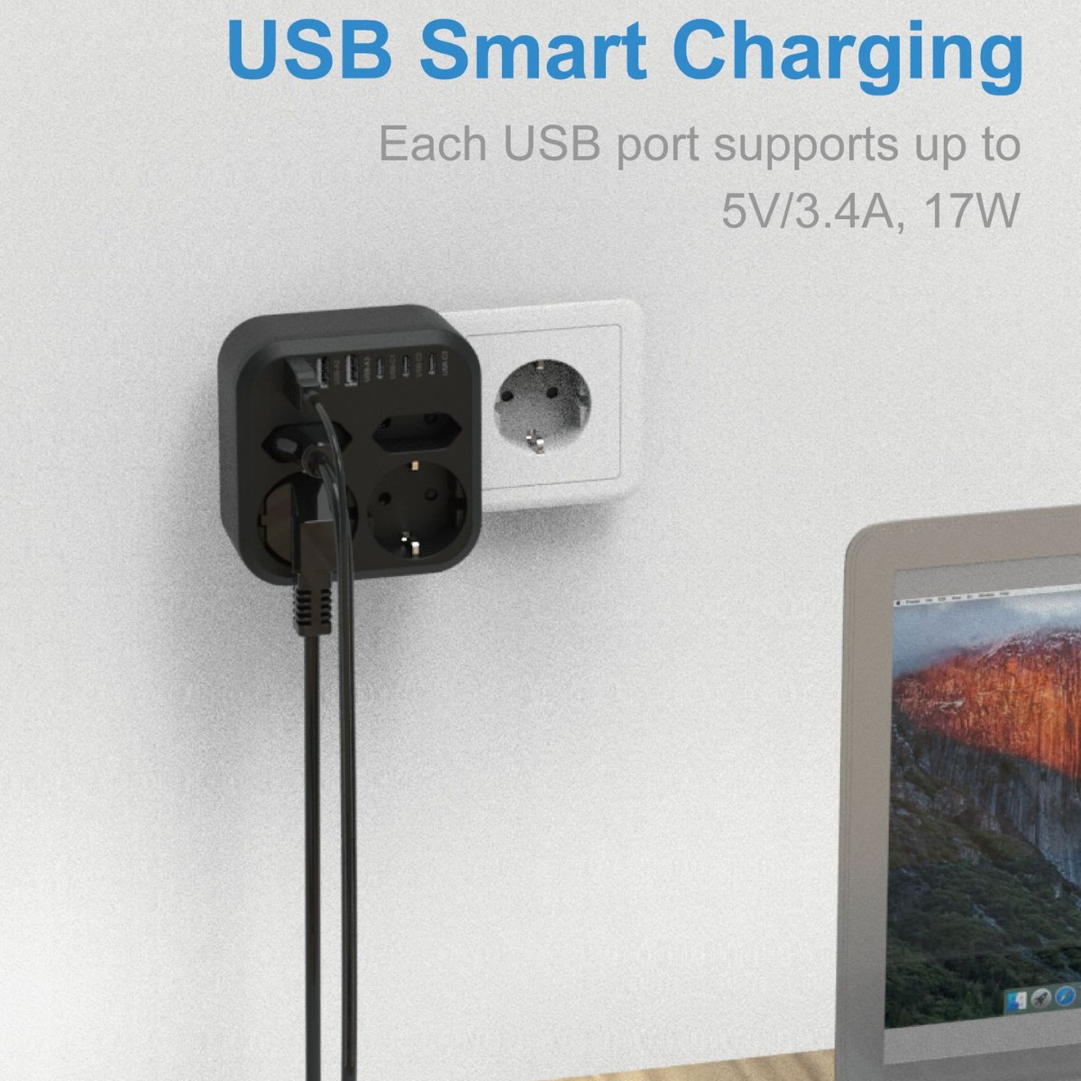方形多口USB TypeC插座转换器欧规德标一转四多功能6孔插座扩展器