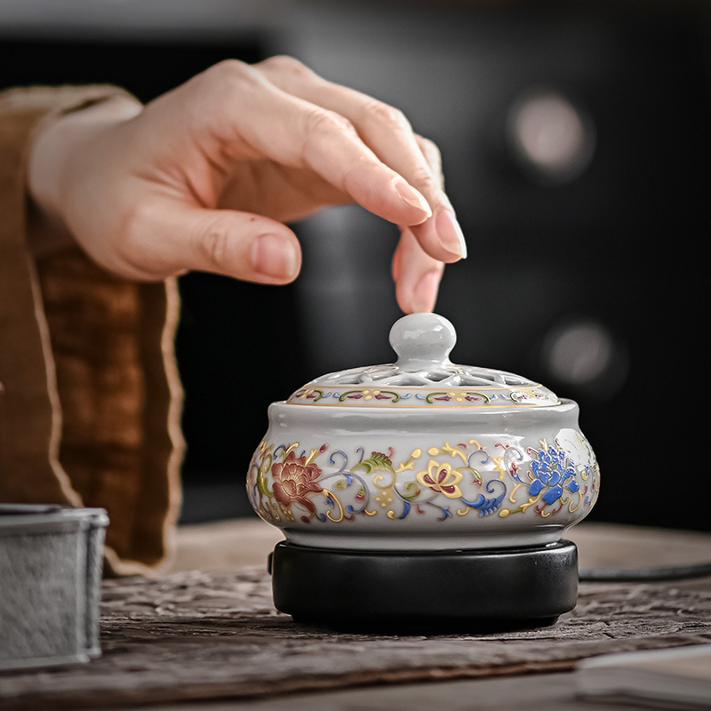 数显电子香薰炉家用定时调温恒温香炉插电珐琅彩缠枝莲花沉香电熏