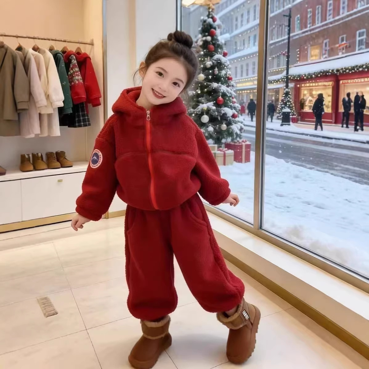 女童冬季加绒加厚套装新款儿童2025宝宝洋气两件套红色喜庆两件套