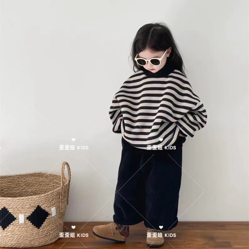 男女童套装复古宽松条纹圆领长袖加绒加厚卫衣灯芯绒直筒裤两件套