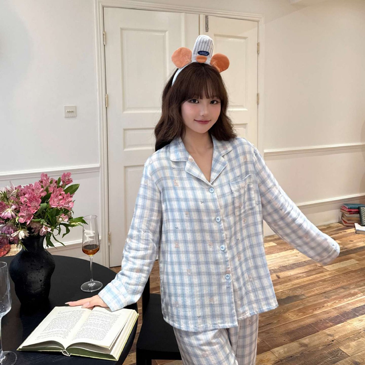 2026新款纯棉睡衣女春秋季蓝色格子甜美风可爱小熊长袖套装家居服