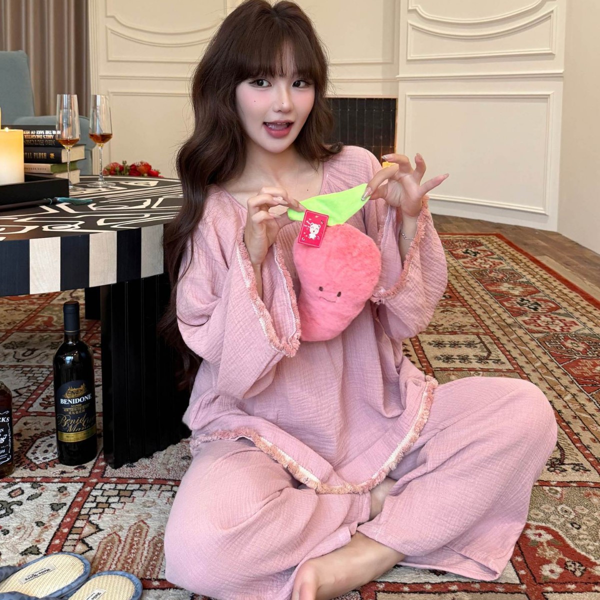 新春季纯棉睡衣女 春夏季长袖长裤套装纯色休闲宽松松弛感家居服