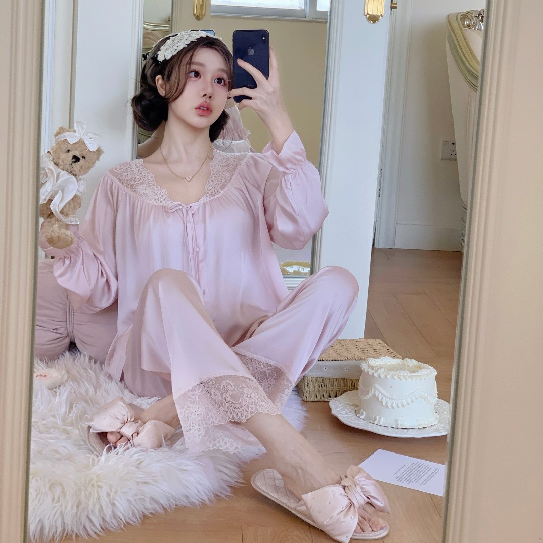 新款春上新温柔风粉雾蕾丝花边冰丝睡衣女轻奢家居服长袖长裤套装