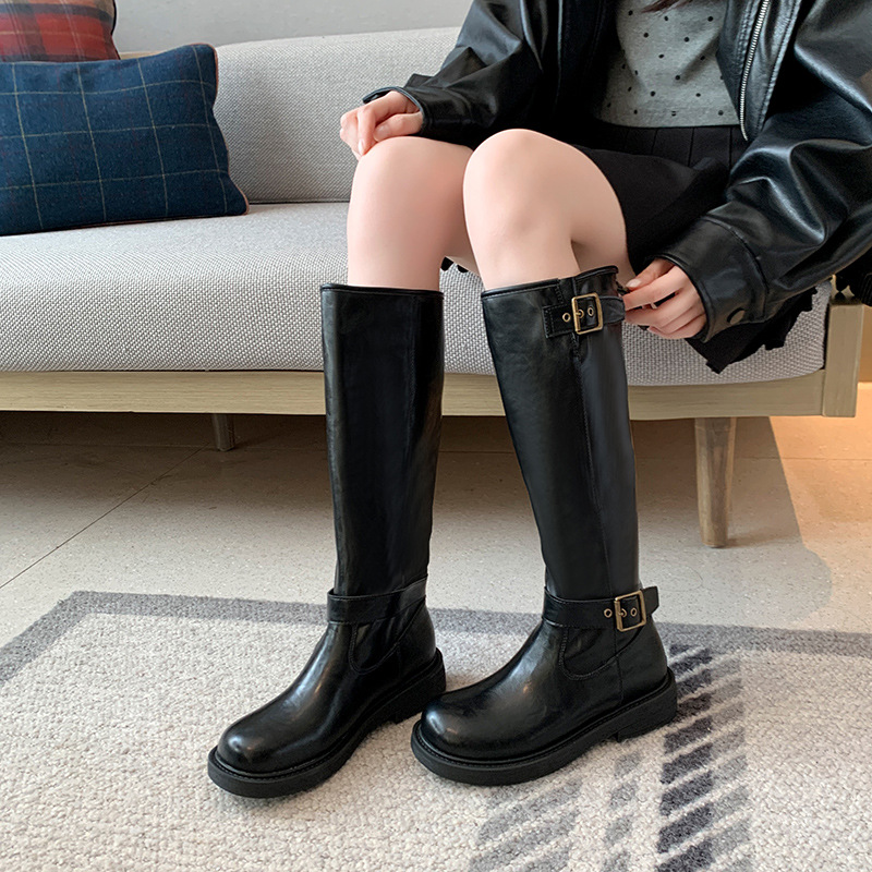 胖mm复古厚底骑士靴皮带扣长筒靴大筒围粗跟高筒靴加宽大码女鞋41