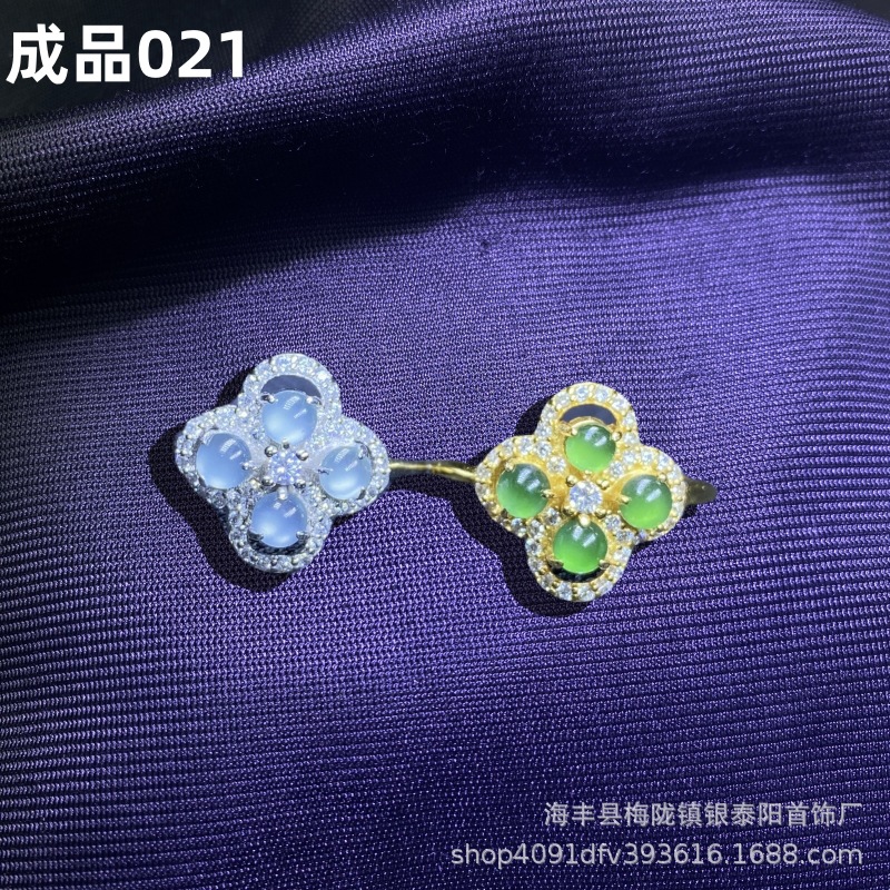 s925纯银四叶草戒指翡翠蛋面小香风重工diy危料银镶成品轻奢小众