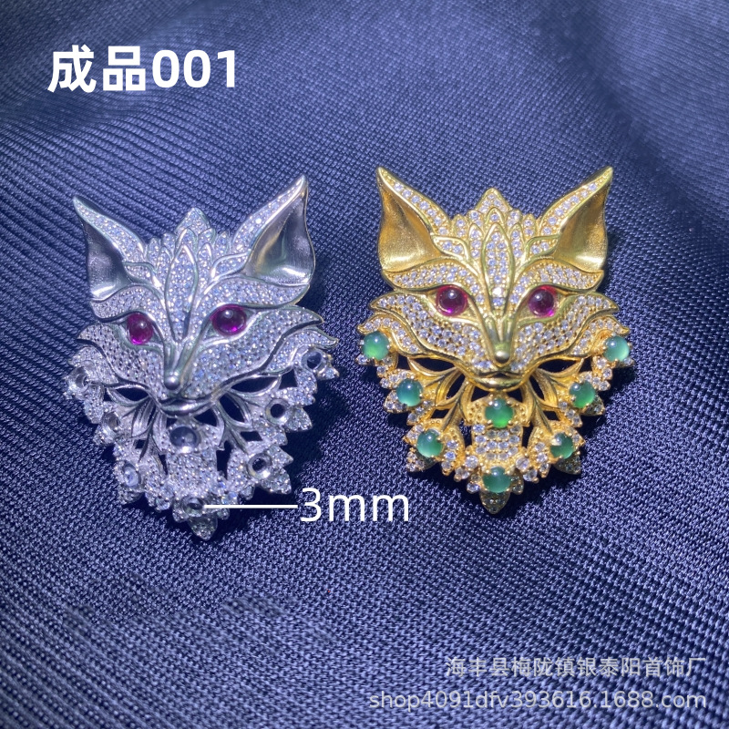 新款s925胸针翡翠蛋面高级感狐狸精工危料银镶成品首饰工厂批发