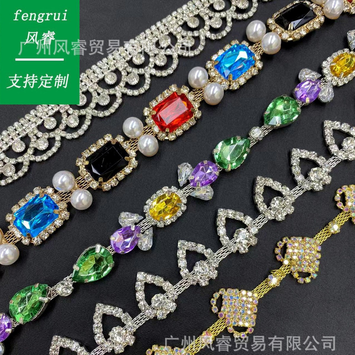厂家直销仿珍珠镶钻彩色宝石链条diy链串珠水钻爪链腰带辅料配饰