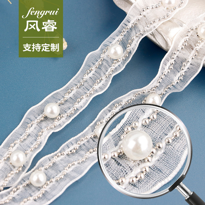 新款手工钉珠花边DIY服装婚纱汉服辅料单边大小珍珠织带条码花边