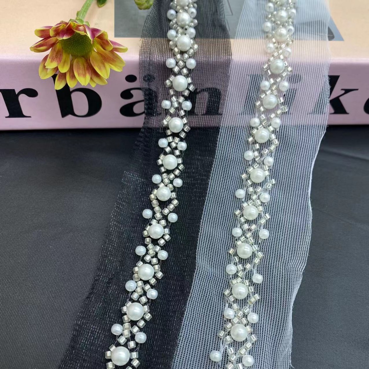 厂家现货黑色网纱珠绣珍珠花边蕾丝钉珠条码礼服婚纱服装装饰辅料
