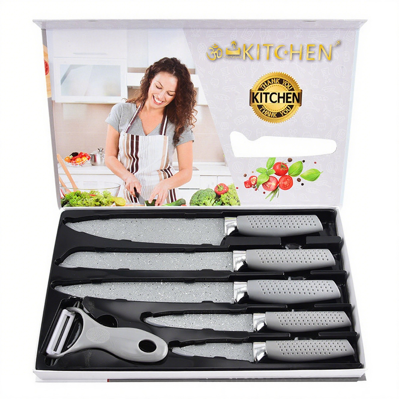 麦饭石燕尾柄六件套手柄带披覆喷橡塑厨房不锈钢刀具礼品盒套装刀