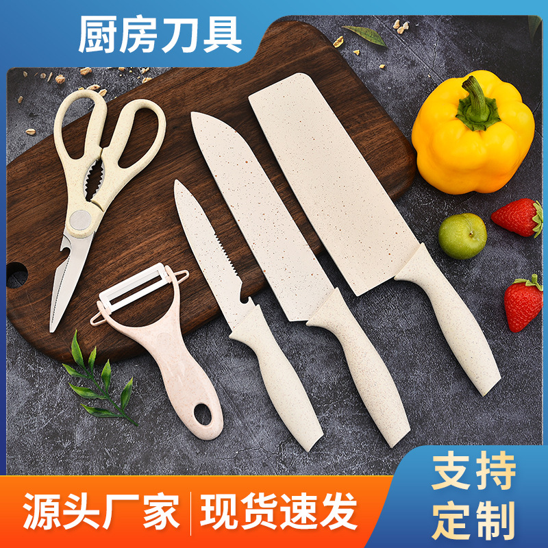 现货小麦秆刀具套装5件套 家用厨房婴儿辅食不锈钢套刀礼品套刀