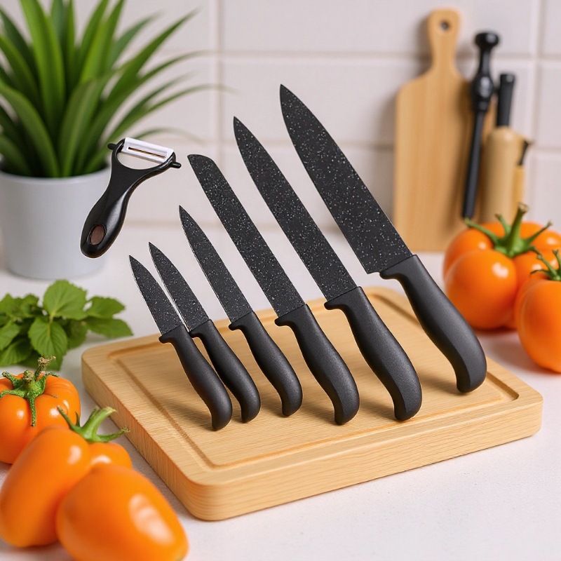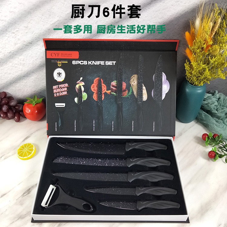 厂家现货厨房多功能刀具套装黑刃六件套橡塑手柄家用送礼商务礼品